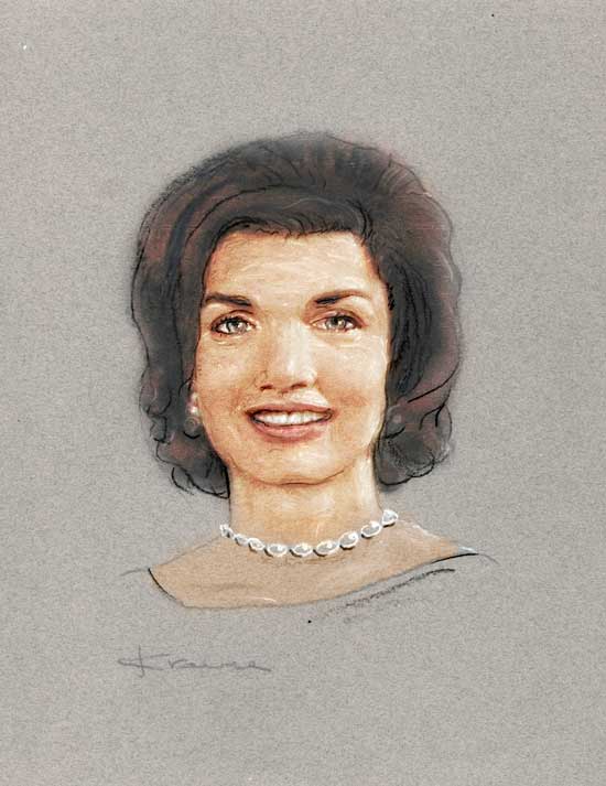 Jackie Oh! Kennedy 8"x10" colorized pastel pencil on gray paper in double-matted 11"x14" Camelot frame.